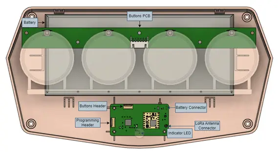The device registers users button presses and periodically sends them to the LoRa gateway which relays the information to the server and then to the end devices.